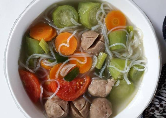 - Masukkan wortel dan bakso, masak hingga setengah matang. Tambahkan oyong dan bihun. Lalu beri garam, gula pasir, kaldu bubuk dan merica. Aduk rata. Cek rasa, masak hingga matang..