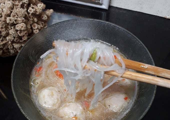 - Siapkan mangkuk isi dg soun.siram dg kuah baso.