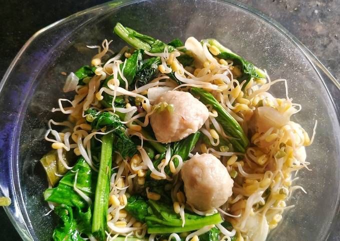 Bahan Yang Diperlukan Untuk Membuat Sayur Sawi Toge Bakso. Tambahkan bawang putih cincang, tumis hingga kecoklatan. Tambahkan arak masak, biarkan alkoholnya menguap. Masukkan bakso dan caisim, aduk rata.