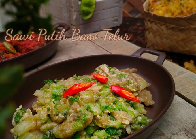 Sawi Putih Baso Telur. Lihat juga resep Sawi Putih Baso Telur enak lainnya. Cuci bersih sawi putih lalu potong-potong. Masukan satu sdm minyak goreng, tumis bawang putih dan cabai rawit sampai wangi.