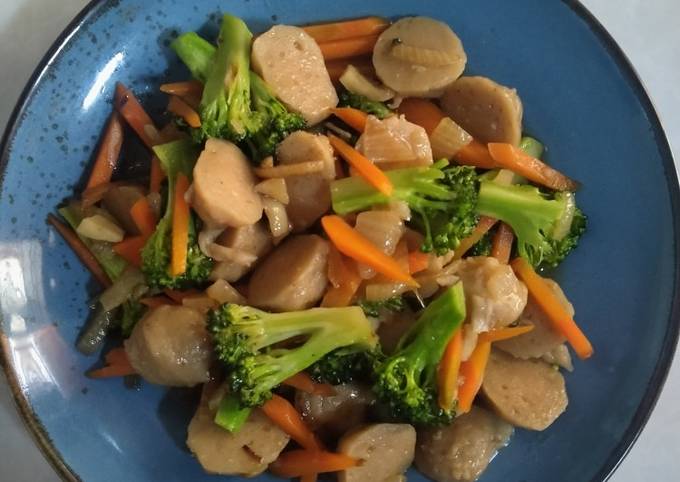 - Tumis bawang putih dan bombay hingga harum, masukan brokoli dan wortel masak hingga layu masukan bakso air dan bumbu2 cek rasa kl ok matikan api.