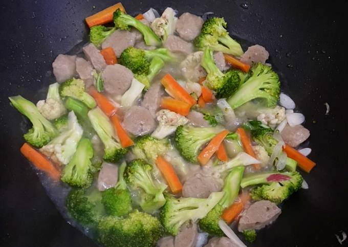 - Tumis bawang merah dan bawang putih dengan minyak goreng hingga wangi. Masukkan wortel, bakso dan air. Tambahkan kecap saori, gula, garam dan kaldu jamur secukupnya (sesuai selera). Jika sudah mendidih, masukkan brokoli dan kembang kol, cek rasa, atur sesuai selera. Jika sayur sudah layu, matikan kompor dan sajikan😁.
