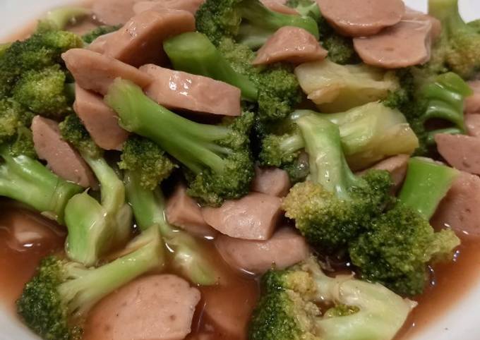 Tumis Brokoli Bakso. Tumis bawang putih dan bawang merah hingga harum. Masukkan bakso dan tumis lagi sebentar. Masukkan brokoli, saus tiram, garam, merica dan kaldu bubuk.
