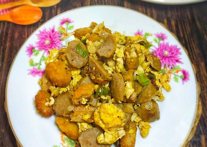Orak Arik telur, lalu pinggirkan beri minyak tumis bawang putih dan daun bawang, aduk rata. Masukkan nugget dan bakso yang sudah dipotong. Beri air, kecap, saus tiram, garam dan lada.
